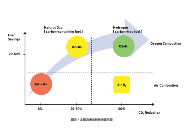 以鋼鐵業為例,超過九成的碳排來自上游鋼鐵冶煉。鋼鐵冶煉為百年工藝,技術成熟,傳統煉鋼每生產 1 公噸的鋼鐵會產出近 2 公噸的碳排。全球鋼鐵產業的二氧化碳年排放量高達 37 億公噸,佔全球碳排量的 10%。在高溫燃燒過程中注入氫氧,因氫氣燃燒後為水不產生二氧化碳,並能提升燃燒效率,為實踐脫碳的方法之一。考量燃燒技術進程,初期可於傳統燃燒採用富氧或全氧燃燒,中期導入部分混氫燃料,長期採用氫氣全氧燃燒。自空氣燃燒爐升級,從中注入氧氣,注入氫氣,達到節省燃料、提高產量、減少碳排的目標。隨著氫氧比例增加,可節省更多化 石燃料,二氧化碳的產出隨之下降(圖三)。