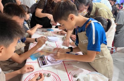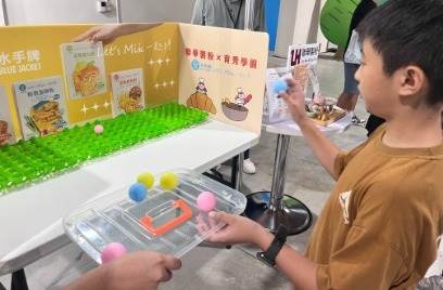 育秀的攤位每年都香味四溢,吸引人潮佇足,為因應無法參與體驗的人潮,我們還規劃了「烘焙夢工廠.賓果挑戰賽」活動,結合環保永續,我們將「小小廚神體驗營」課程中回收的「塑膠蛋盤」,清洗消毒後成為最好玩的棋盤,小朋友只要將乒乓球彈進棋盤中,五個棋子連成任意方向一條線即為勝利,就能獲得「聯華製粉水手牌蛋餅粉」或「水手牌日式炸雞粉」,經典好禮就是希望讓忙碌世代的親子也能變成大廚,讓無添加少添加的健康美味成為日常。