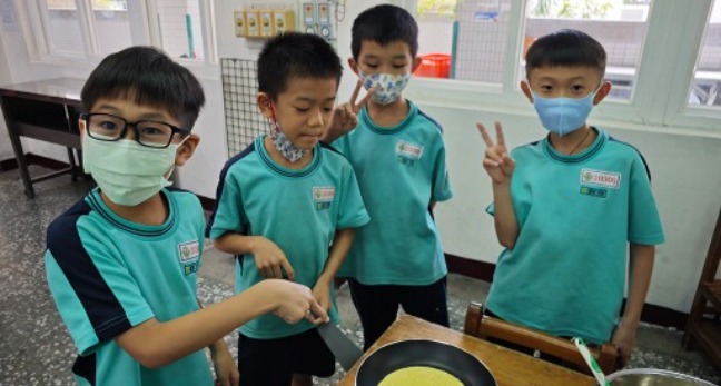 學生期待已久的育秀食農教育行動車終於來囉!映入眼簾的是一組組整齊擺放的廚房器皿:有大鋼盆、小鋼盆、攪拌器、刮刀、鍋鏟與卡式爐,還有各式各樣的食材,其中很特別的是有米製的雞蛋糕粉,還有健康好吃的米餅。大夥兒開心享受美食時,也不忘再次複習一下所學的知識內容,期待未來能研發更多的米製品,鞏固學童的身體健康,也行銷台灣稻米。