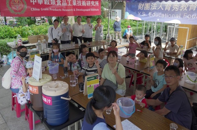 育秀教育基金會與穀研所共同合作設置攤位,是場中最大也最受歡迎的攤位,正值暑假天氣炎熱,親手操作的「分子食物」,讓民眾體驗生活中的基礎科學,個個做得有模有樣,又能吃含有「紫色晶球與薯條」的爆爆珠果汁,吸引排隊人潮。