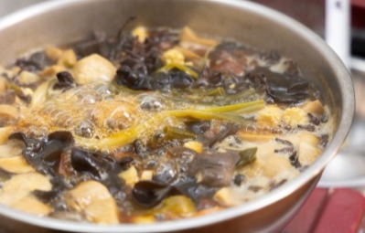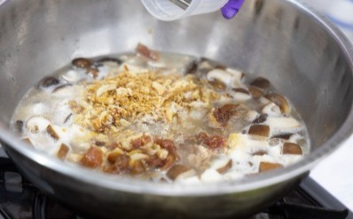 3.加入高湯→芋頭→絞肉→新鮮香菇→白飯(小火滾煮)持續慢慢的攪拌,滾煮15分鐘關火。