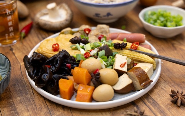 豆干、紅蘿蔔、杏胞菇、玉米筍、鳥蛋、木耳、鳥蛋起鍋後,淋上少許的醬油膏、香油、蔥花,再享用。 -