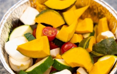 2.南瓜、杏胞菇、番茄、櫛瓜放入鋁箔盤中。