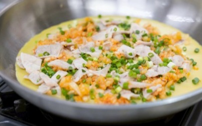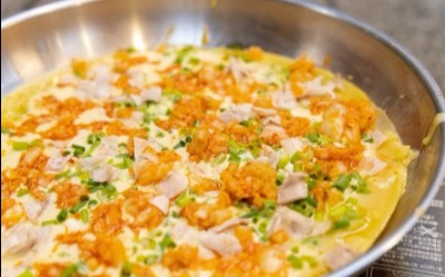 水350g、雞蛋60g(一顆)、水手牌粉漿蛋餅粉250g、沙拉油30g、韭菜30g、紅蘿蔔30g、青蔥50g、泡菜100g、豬五花50g