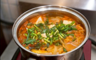 水700g、韓式泡菜300g(泡菜150g、湯150g)、年糕條100g、洋蔥100g、豆腐300g、豬五花肉片100g、綠韭菜30g