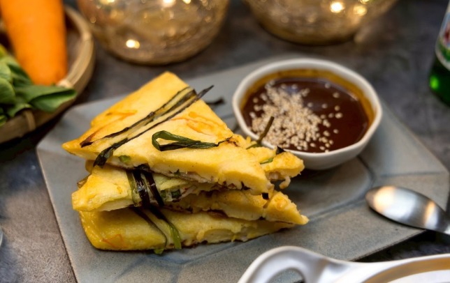 3.平底鍋加油→韭菜及紅蘿蔔→熱鍋小火→放入麵糊→撒上泡菜+豬五花+青蔥→煎五分鐘→翻面煎熟雙面上色→盛起來另外搭配醬料。